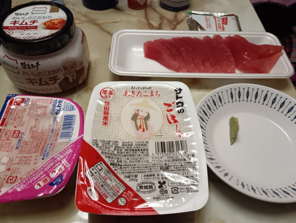 で、金曜の晩は帰りに24時間営業のスーパーに寄って刺身とか買って、一週間の稼働をねぎらうのが最近の自分の習慣になってます。しかしこれもなあ。まず米が高いじゃないですか。パックご飯300グラムで350円くらい掛かってる(汗)。で、刺身は冊買いで800円。キムチは一番美味い宗家キムチ。あと味噌汁。この程度のシンプルな食事で1300円くらい掛かってるんですよね。
