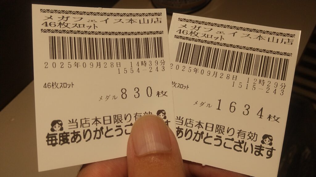 昼過ぎに2400枚程のメダルを流す(レシートが2枚あるのは、目立たないように一度途中で流した為)。で、「見」に回った訳ですけど・・・自分の打ったマイジャグは4すらなかったぽいな(汗)。その後ボロボロに凹んでました。ジャグラーって設定3くらいあると、高設定丸出しの挙動で3000枚くらいなら出てしまうことがある・・・と、個人的には思っております。ホンモノとの見分けが非常に困難なので注意が必要です。まあその辺りは店の傾向や周囲の状況から判断するしかないですね。この日はジャグラー全台設定3以下だったと思われます。