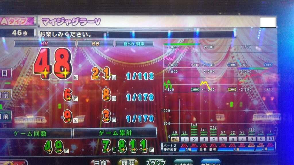 7811ゲームでBIG48(1/162)のREG21(1/371)。圧倒的BIG寄りで5000枚弱ゲット。